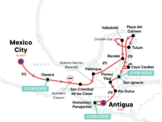 Your Big Night Out Moment: Antigua Guatemala. Mexico City street food crawl. Alebrijes Artisan Community visit. Boat trip to Sumidero Canyon. Stop at Roberto Barrios Waterfall for a swim. Tour the Mayan ruins in Palenque. A boat adventure into a gorgeous lagoon in Bacalar. Chichen Itzá ruins guided tour. Guided tour of Tikal. Orientation walk in Antigua. Beach time in Playa del Carmen and Caye Caulker. Free time in Mexico City, Oaxaca, Palenque, San Cristóbal de las Casas, Playa del Carmen, Caye Caulker, and Antigua. All transport between destinations and to/from included activities.