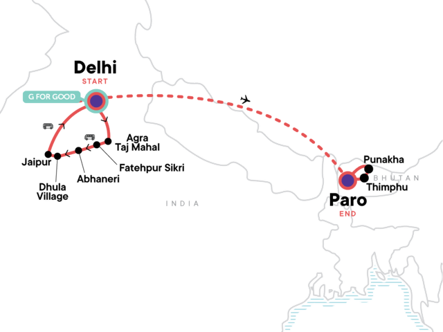Your Welcome Moment: Welcome Moment - Meet Your CEO and Group. Sustainable Development Fees. Agra Fort visit. Taj Mahal visit. I'timad-ud-daulah (Baby Taj) entrance. Fatephur Sikri visit. Jaipur City Palace entrance and guided tours. Abhaneri stepwell visit. Memorial Chorten & Motithang Takin Preserve visit. Chimi Lakhang Hike. Explore Paro Dzong and Archery grounds. Free time in Thimphu, Punakha, and Paro. Hike to Taktsang Monastery Tiger's Nest. All transport between destinations and to/from included activities.