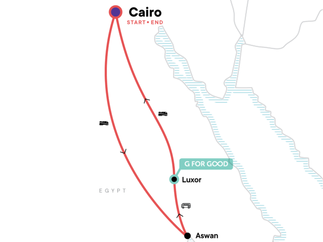 After breakfast the group will sail by ferry to the West Bank to meet our student-guide. Together we will bike through the village and visit the Funtasia Project Center where the group will learn about the Planeterra project at this location over tea with our guide. Afterwards, cycle back to the waterfront and board the ferry to travel back across the Nile. Spend a free afternoon in Luxor at your leisure, or choose to join the East Bank optional excursion. In the evening board an overnight train back to Cairo.