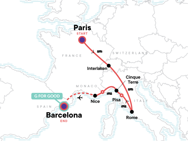 Your Big Night Out Moment: Barcelona. Visit to the Leaning Tower of Pisa. Cinque Terre park fee with unlimited train rides and CEO-led hike. Visit to Monaco. Orientation walk in Interlaken.