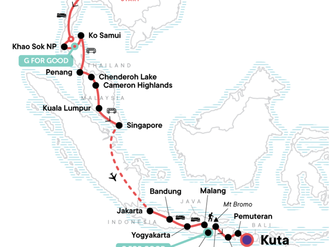 Your Big Night Out Moment: Kuta Dance Party, Kuta. Ang Thong National Marine Park Visit. Orientation walks in Cameron Highlands and Bandung. Entrance to Bromo Tengger Semeru NP. Mt Bromo crater walk. Sunrise hike to Mt Bromo viewpoint. Street food crawls. Internal flight. All transport between destinations and to/from included activities.