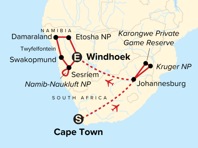 Discover the wonders of South Africa and Namibia on this extraordinary adventure, traveling from captivating Cape Town and the wilds of Kruger National Park to the dramatic dunes of the world’s oldest desert. Gaze out over the Atlantic seaboard from iconic Table Mountain; track the famed "big five" in a private game reserve alongside a researcher from the National Geographic–sponsored Big Cats Initiative; and marvel at ancient rock engravings in Twyfelfontein, Namibia's first UNESCO World Heritage site.