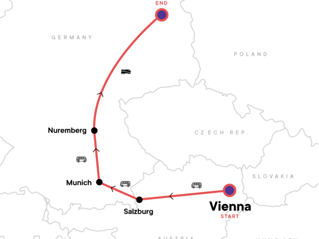 Your Welcome Moment: Welcome Moment - Meet Your CEO and Group, Vienna. Welcome meeting and dinner. Orientation walk in Vienna. Christmas markets visit Vienna. Coffee/pastry tasting Vienna. Private transfer to Salzburg. Free time in Salzburg. Salzburg Christmas market visits with CEO. Private transfer to Munich. Hellbrunner Christmas Market visit. Free time in Munich. Private transfer to Nuremberg. Christmas market visit in Nuremberg. Train ride to Berlin. Orientation walk in Berlin. Christmas market visit in Berlin. Mug of Glühwein (mulled wine). Free time in Berlin. 24hr transit pack in Berlin and Vienna.