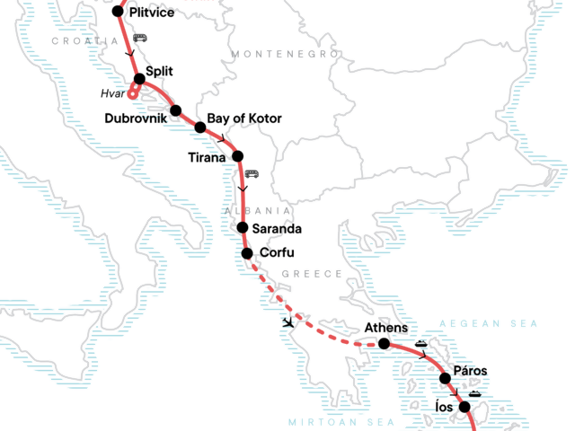 Your Discover Moment: Athens. Orientation walks in Zagreb, Split, Tirana, Corfu, Paros and Ios. Entrance to Plitvice Lakes National Park. Day trip to Hvar. Guided tour of Diocletian's Palace (Split). Internal flight. Free time in Paros and Ios. Half-day Paros beaches tour. Best of beaches tour Ios. Caldera walk in Santorini. All transport between destinations and to/from included activities.