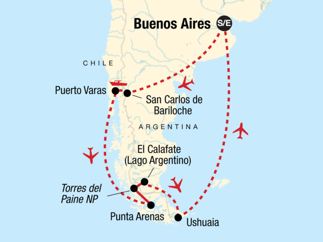 Your Discover Moment: San Carlos de Bariloche. Arrival transfer. Bariloche Circuito Chico tour. Scenic lake crossing aboard the "Cruce de Lagos". Excursion into Torres del Paine National Park. Guided tour to the Perito Moreno Glacier. Buenos Aires city tour. Internal flights. All transport between destinations and to/from included activities.