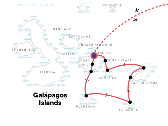 Flights to either of the airports in the Galapagos leave early in the morning on Day 2 and get you into the islands in the early afternoon. Flights back to the mainland depart between 10:00am and 1:30pm arriving in the early evening.