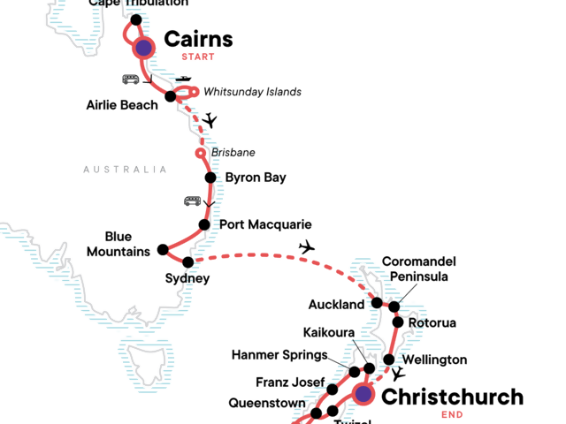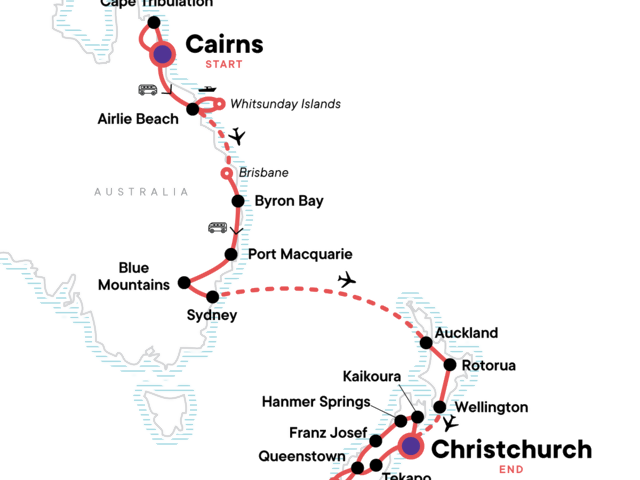 Your Discover Moment: Queenstown. Indigenous Peoples Interpretive Walk at Mossman Gorge. Whitsunday Islands Boating Excursion. Barrier Reef Visit. Blue Mountains Excursion. Byron Bay surf lesson. Jamison Valley Walk. Blue Mountains Scenic Railway. Winery Visit. Waitomo Glowworm Caves. Doubtful Sound Wilderness Cruise. Aoraki/Mount Cook National Park Visit. Internal flights. All transport between destinations and to/from included activities.