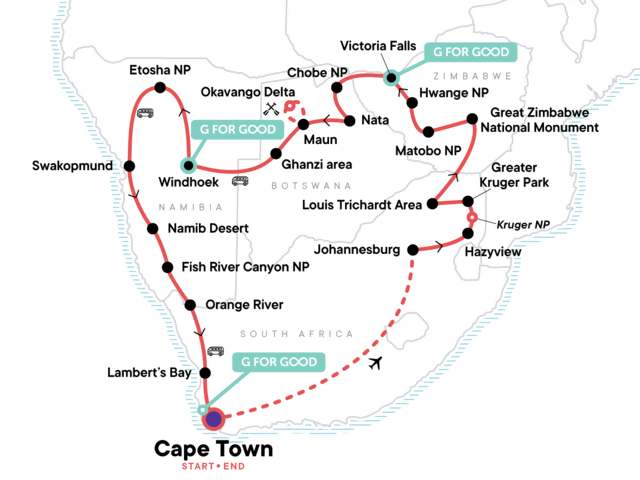 When you put the word “highlights” in the name of a trip, you better be confident that it lives up to the hype. This trip does. Across 30 epic days, you’ll go round-trip to Cape Town via Zimbabwe, Botswana, and Namibia — a new spin on one of our most popular routes — taking comfortable touring vehicles as well as staying in a mix of hotels and campsites for a well-rounded experience. Wildlife sightings and cultural moments come standard here — everything from searching for the "big five" in national parks to enjoying meals with local families. You’ve got memories made for a lifetime.