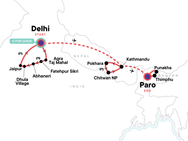 Your Local Living Moment: Barauli Community Guesthouse Stay, Royal Chitwan National Park. Sustainable Development Fees. Agra Fort visit. Taj Mahal visit. I'timad-ud-daulah (Baby Taj) entrance. Fatephur Sikri visit. Jaipur City Palace entrance and guided tours. Abhaneri stepwell visit. Guided tour of Bhaktapur City. Nepalese Dumplings Cooking Demonstration. Boudhnath Stupa visit. Chitwan National Park 4x4 safari. Cycling through villages in Chitwan. Memorial Chorten & Motithang Takin Preserve visit. Tashichho Dzong visit. Chimi Lakhang Hike. Explore Paro Dzong and Archery grounds. Hike to Taktsang Monastery Tiger's Nest. All transport between destinations and to/from included activities. Flights from India to Nepal and Nepal to Bhutan.