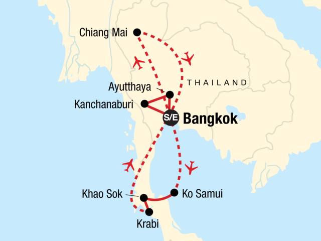 Experience the timeless grandeur of Thailand’s cities, temples, and landscapes on a cross-country adventure. Explore the rich cultural heritage and culinary delights of Chiang Mai, then head south to discover tropical coastlines. Stroll the sun-drenched shores of Ko Samui, and venture to limestone cliffs and sacred caves in Krabi. In each destination, marvel at intricate palaces and monasteries, meet locals in village homes and traditional workshops, and delight in the flavours of authentic Thai cuisine.