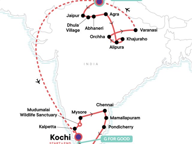 Your Local Living Moment: Kerala Backwaters Homestay, Alleppey. Old Delhi walk. Amber Fort tour. Rajasthani rural village stay. Dhula Village cycling excursion. Taj Mahal, Baby Taj and Agra Fort tour. Orchha Palace complex visit. Western Temple complex visit. Ganges River boat trips at sunrise and sunset, including candle flower ceremony. Fort Kochi orientation walk. Wayanad Tea Plantation and Factory visit. Chaumundi Temple and Mysore Palace visit. Mamallapuram Shore Temple visit. Pondicherry orientation walk. Madurai cycle-rickshaw ride and Sri Meenakshi temple visit. Cardamom Hills spice plantation tour. Internal flights. All transport between destinations and to/from included activities.