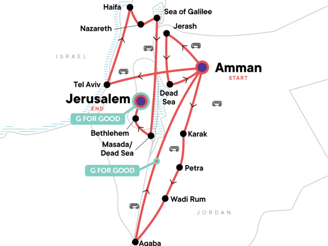 Your Local Living Moment: Druze Village Visit and Traditional Lunch , Isfiya Druze Village. Tel Aviv Old Port of Jaffa. Akko, Nazareth and Bethlehem visits. Sea of Galilee tour. Guided tour of of Masada. Jerusalem sightseeing including Al Aqsa, the Western Wall and Holy Sepulcher Church. Jerash guided tour. Dead Sea visit. Madaba mosaics tour. Mt Nebo. Karak Castle tour. Petra guided tour. Wadi Rum jeep excursion. All transport between destinations and to/from included activities