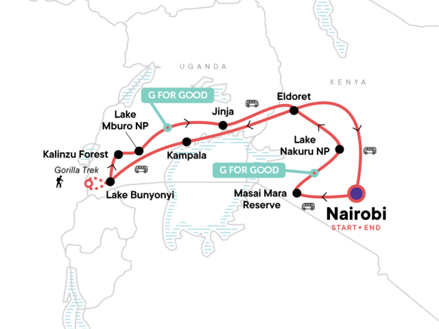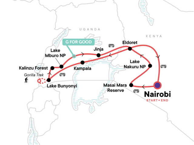Your Discover Moment: Jinja. Wildlife safari drives in Masai Mara National Reserve. Safari in Lake Nakuru National Park. Guided mountain gorilla trek in Bwindi with permits. Entrance and chimpanzee tracking in Kalinzu Forest Reserve. Tea plantation visit. Transfer from Jinja to Nairobi. All transport between destinations and to/from included activities.