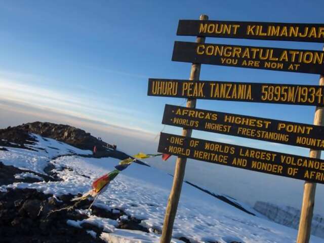 At midnight, begin the summit trek. Conquer the rim of the main crater, then cross the scree and snow to Uhuru Peak. Descend to Mweka Camp.