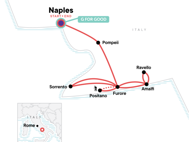 Your Welcome Moment: Welcome Moment - Meet Your CEO and Group. Guided tour of Pompeii. Hike along the famous "Path of the Gods" (weather permitting). Visits to Amalfi, Ravello, and Sorrento. Two pre-dinner cooking demonstrations at the agriturismo. Orientation walk in Naples. Orientation walk in Sorrento. Transport between destinations and included activities.