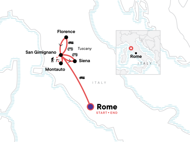 Your Local Living Moment: Home Cooked Dinner with Ugo, San Gimignano. Orientation walks in Rome, San Gimignano, and Siena. Walk along San Gimignano's medieval wall. Quarter-day walk through the Tuscan countryside to Montauto. Day trips to Siena and Florence. Transport between destinations and included activities.