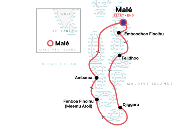 In the morning, make the short crossing to Malé. The tour ends on arrival at Malé International Airport.
