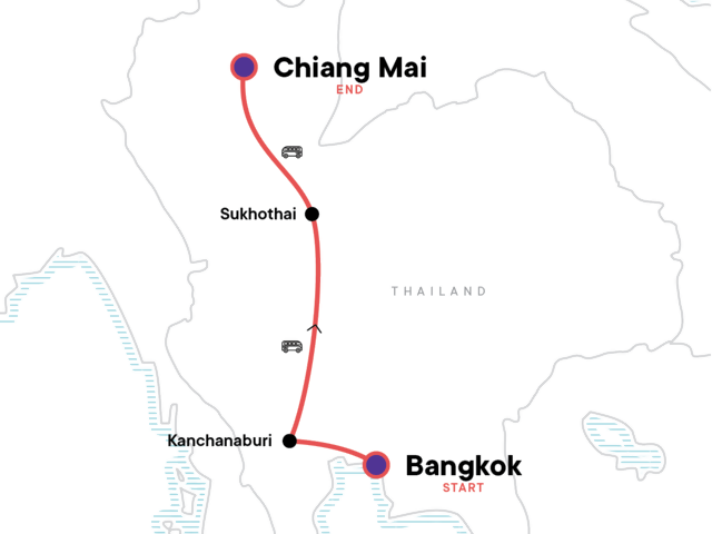 Your Big Night Out Moment: Chiang Mai Celebration, Chiang Mai. Visits to Thai/Burma Railway Centre and Allied War Cemetery. View the Bridge on the River Kwai. Erawan National Park and waterfall visit. Bike ride in Sukhothai Historical Park. Chiang Mai Orientation walk and street food crawl.