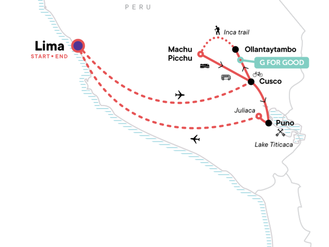 Your Local Living Moment: Lake Titicaca Homestay, Lake Titicaca. Biking excursions in the Sacred Valley (2 days). Inca Trail guided hike with cooks and porters (4 days). Guided tour of Machu Picchu. Kayaking excursion on Lake Titicaca with visits to Taquile, Amantaní, and the Uros Islands (2 days). Internal flights. Transport between destinations and to/from included activities.