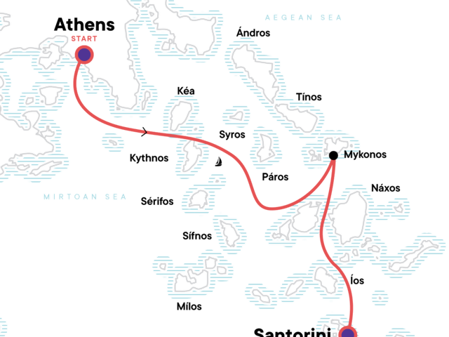 Possible island stops include: Naxos, Paros, Antiparos, Ios, Sifnos, Folegandros. The order of stops over the next few days will be weather dependent.