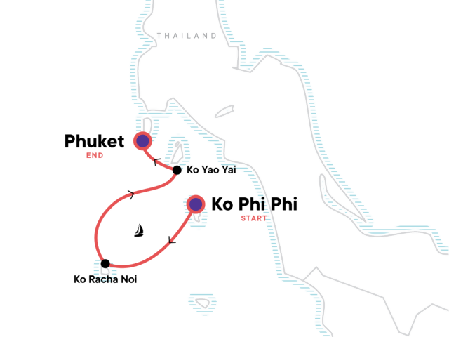 Sail the Andaman Islands of Thailand. Island visits to Ko Phi Phi Don and Le, Ko Raja Noi, and Ko Yao Yai. Snorkelling equipment and two kayaks.