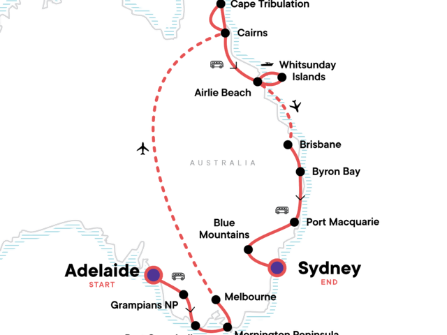 Your Welcome Moment: Welcome Moment - Meet Your CEO and Group. Melbourne laneways walk. Brighton bathing boxes visit. Rainforest walk in Great Otway NP. 12 Apostles visit. Loch Ard Gorge Visit. Hike at Grampians NP. Tower Hill State Wildlife Reserve Visit. Explore Cape Schanck lighthouse. Guided Daintree Rainforest walk. Whitsunday Islands boating excursion. Blue Mountains stay with hikes. Scenic Railway. Orientation walk in Sydney. Free time in Cairns, Byron Bay, and Sydney. Internal flights. All transport between destinations and to/from included activities.