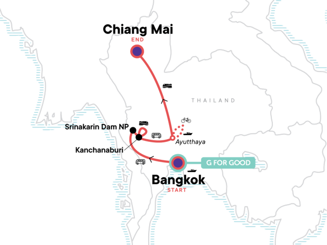 Your Foodie Moment: Street Food Dinner in Chinatown, Bangkok. Bangkok Klong Riverboat Tour. Visit Hellfire Pass and Ride the Death Railway. Visit Bridge on the River Kwai and Thai/Burma Railway Centre and Allied War Cemetery. Visit a Local Rice Farm. Ayutthaya Cycling. Boat Tour. Chiang Mai Old Town Orientation Walk. Chiang Mai Night Market Walk. Sunrise Alms Giving. Doi Suthep Temple Visit. All transport between destinations and to/from included activities.