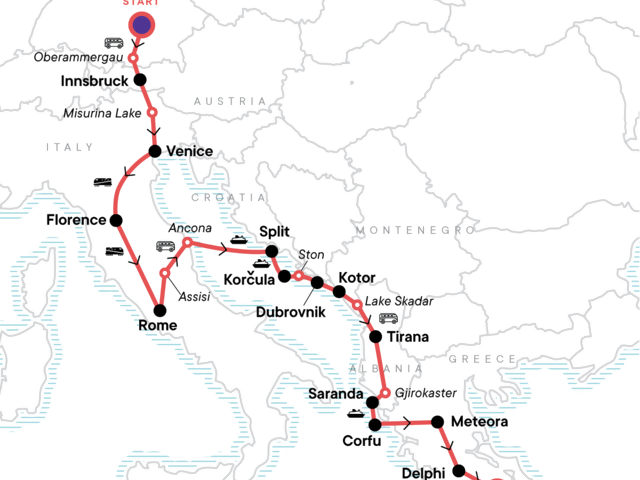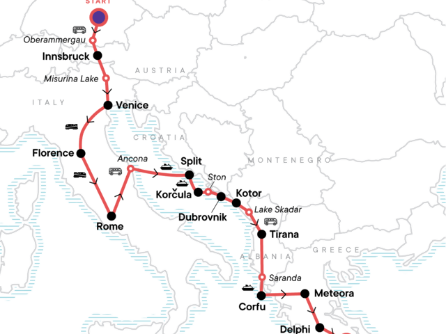 See the intricate wood carvings in Oberammergau, Hike in the Italian alps along Lake Misurina, Sample delicious local food in Rome, Take a boat to the island of Korčula along the Dalmatian Coast, Walk along the wall from Ston to Mali en route to Dubrovnik, Take a scenic drive along Kotor Bay with a stoop in Perast, Walk to Kotor fortress at sunrise, See Skadar Lake, Visit the magnificent Monasteries in Meteora, Experience the Delphi Ancient Ruins with your CEO, Lay your eyes on famous landmarks like The Parthenon, the Acropolis, and Temple of Zeus, Grab a drink at Shedia, a G Adventures—supported café, Travel through miles of beautiful coastal scenery, Enjoy orientation walks and free time for optional activities in the major cities.