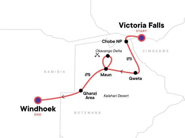 Buckle those seat belts and as the mist from the falls leaves the air cross the border from Zimbabwe into Botswana. Waste no time and choose to take a wildlife viewing boat cruise along the fertile lands of the Chobe River. Then relax and unwind at camp with your group, telling stories, singing songs, and just enjoying one another's company in this serene country.