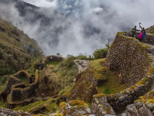 Cross two more passes and ruins on today's trek. The first pass is Runquraqay at 3,950m (13,113 ft) where, on a clear day, hikers can catch a glimpse of the snow-capped Cordillera Vilcabamba. Hike through the cloud forest on a gentle climb to the second pass of the day, walking through original Incan constructions. The highest point of the pass is 3,700m (12,136 ft). On a clear day, enjoy the spectacular views of the Urubamba Valley. At 3,650m (11,972 ft), reach the ruins of Phuyupatamarca, the "town above the clouds." Camp here or go another 1.5 hrs to the Wiñay Wayna ruins ("forever young") located at 2,650m (8,694 ft).