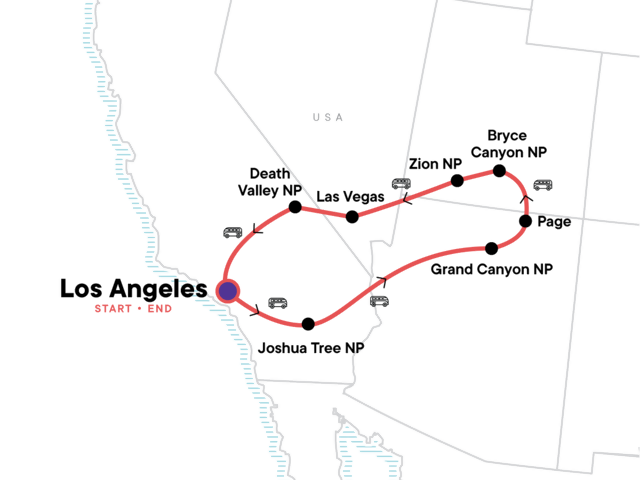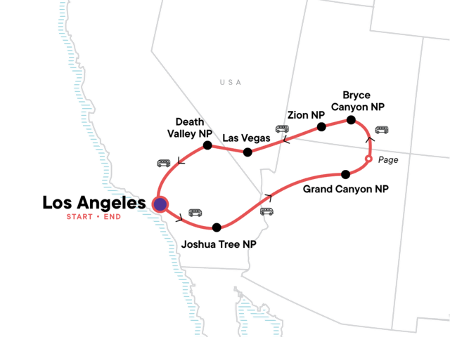 Your Welcome Moment: Welcome Moment - Meet Your CEO and Group. Visit to Joshua Tree National Park. Drive along Route 66. Grand Canyon sunset pizza dinner. Hike in Grand Canyon National Park. Visit to Horseshoe Bend. Bryce Canyon National Park visit. Zion Glamping. Zion National Park visit. Free time in Las Vegas. Death Valley National Park visit. Entrance fees to all national parks and monuments with hiking and walking excursions. Self-inflating mattresses and dome tents. All transport between destinations and to/from included activities.