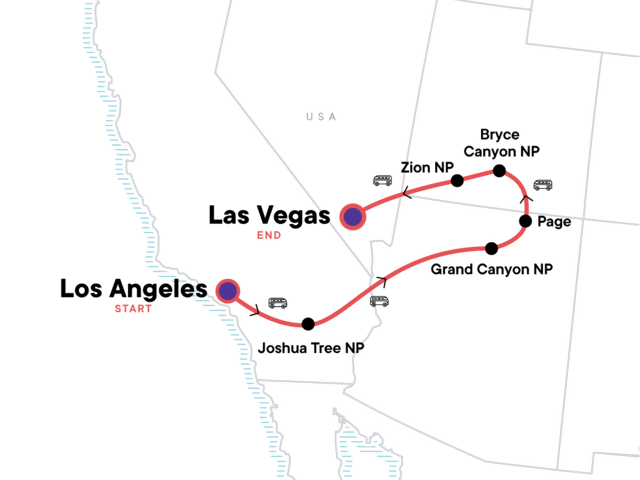 This morning opt to get in one last activity at our Glamping site if you ran out of time yesterday or simply relax in the wild surroundings. Then the group will drive from Zion to Las Vegas where the tour ends on arrival.