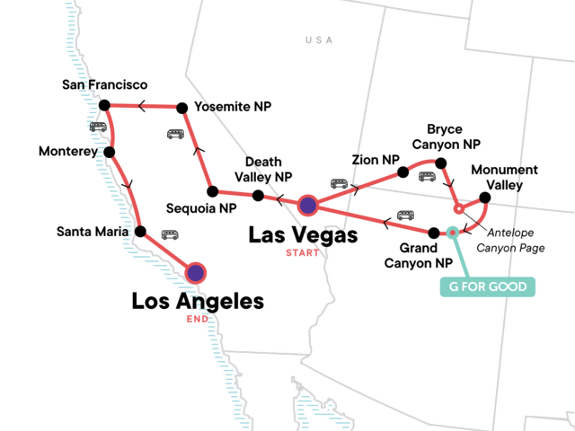 Your Welcome Moment: Welcome Moment - Meet Your CEO and Group. Zion National Park visit. Bryce Canyon National Park visit. Horseshoe Bend and Antelope Canyon visits. Navajo guided Monument Valley jeep tour. Full day hiking in Grand Canyon National Park. Drive along Route 66. Death Valley National Park visit. Sequoia National Park visit. Yosemite National Park visit. Stops in Monterey and Santa Maria en route to Los Angeles. Entrance fees to all national parks and monuments with hiking and walking excursions. All transport between destinations and to/from included activities.