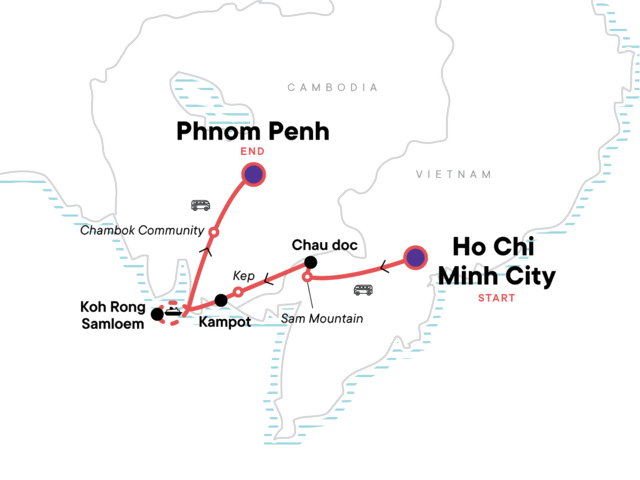 Sample street food in bustling Ho Chi Minh City, Explore Sam mountain and Hang cave Pagoda by motorbike, Slurp noodle soup from a floating vendor, Snap selfies at the moss-covered ruins in Monivong Bokor NP, Bake on the whitesand beaches of Koh Rong island